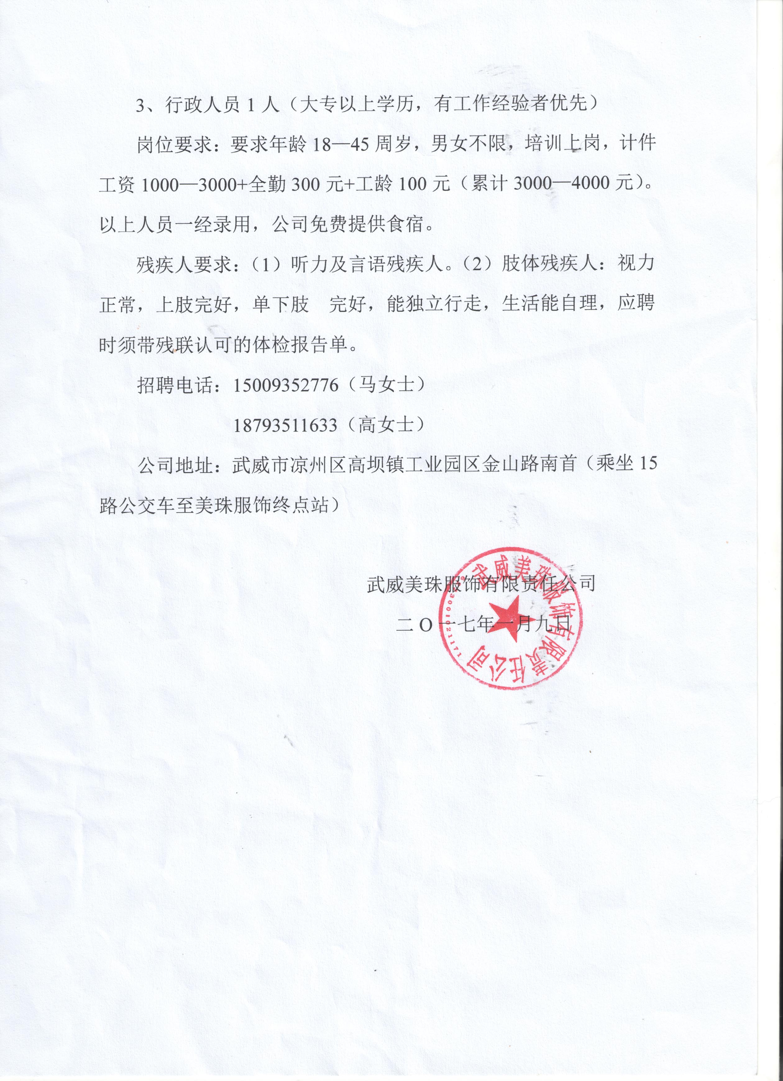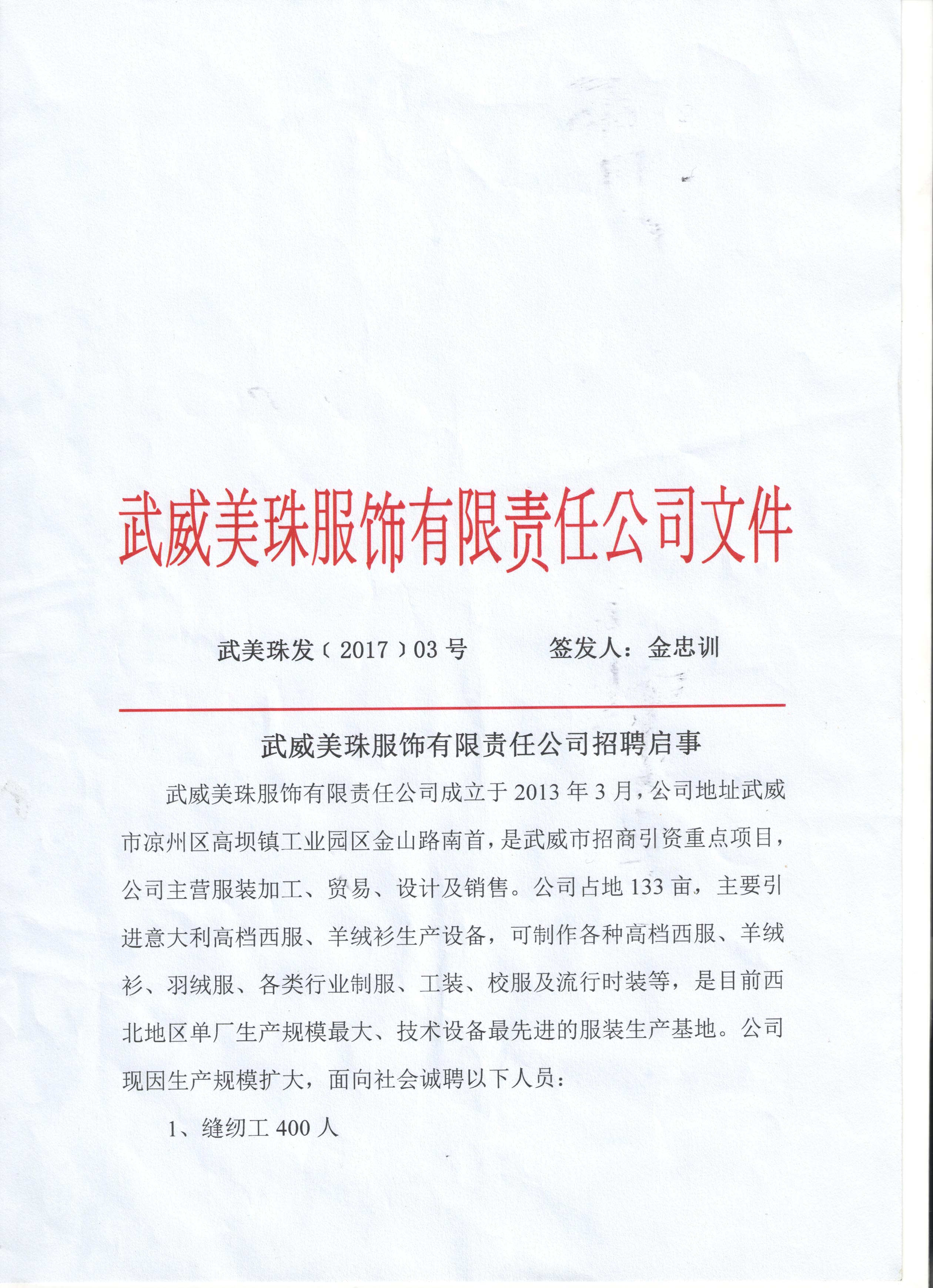 武威美珠服饰有限责任公司招聘启事